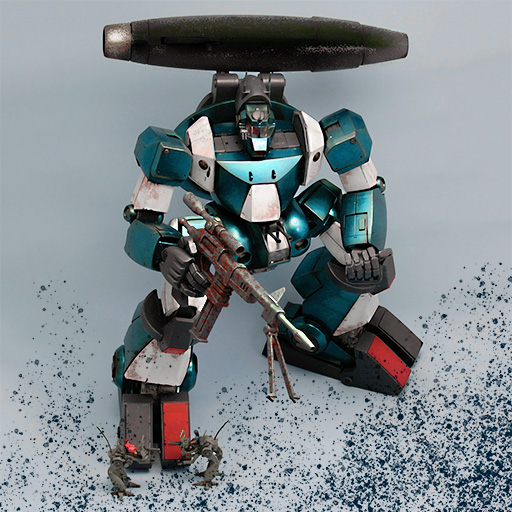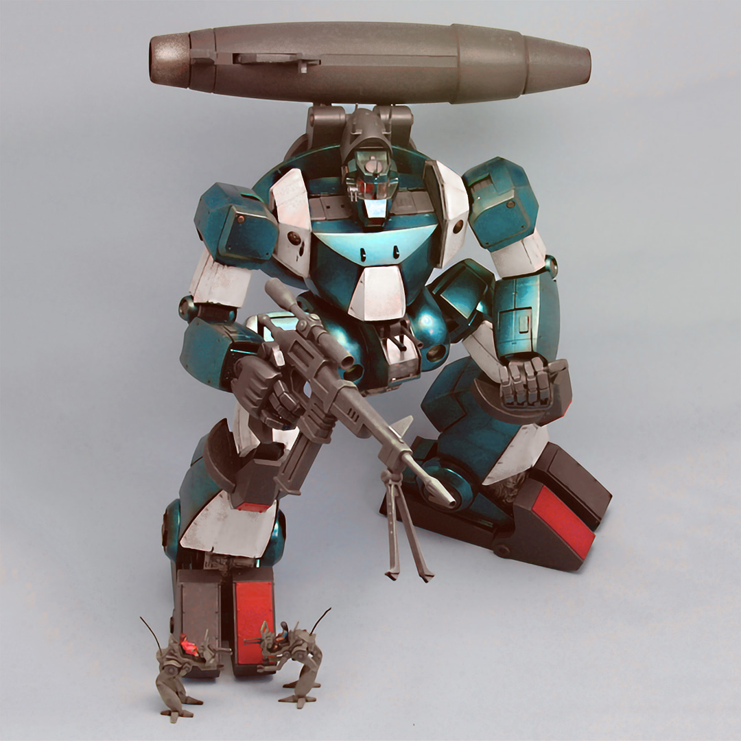 いろいろのっぺりしているところに汚しやノイズなどを書き足す。レッグタイプのアンテナは真っ直ぐ(たしかこれはピアノ線)なのが不自然なので曲げた。銃はコピーして重ねて他と違う金属感がでるように。